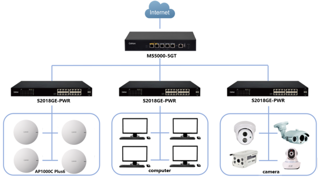 集合路由、核心交换、无线控制(AC)、防火墙、认证管理、行为管理等六大功能为一体,一机解决传统方案中需要分别购置多台设备的难题。Cetron MS5000-5GT可以管理64台Cetron无线AP,集中完成无线配置管理工作。同时最多可以下发4个不同的网段解决Vlan的划分问题。